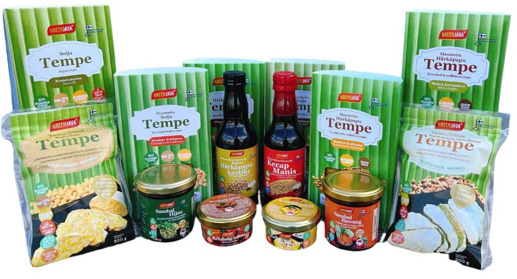 (härkäpapu- ja soijatempe origional, härkäpapu- ja soijatempe korianteri ja kurkuma).